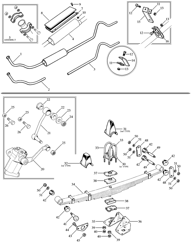 | # | PART # | DESCRIPTION | APPLICATION | Qty | BUY | SELL | | 1 | ARA16 | EXH ASSY | TO (C) 448800. | 1 | N/A | SELL | | | GEX113 | EXH ASSY | FROM (C) 448801. | 1 | N/A | SELL | | 2 | GEX2633 | FRONT PIPE | | 1 | N/A | SELL | | 3 | ACA5030 | REAR PIPE | TO (C) 283013. | 1 | N/A | SELL | | | ARA636 | REAR PIPE | FROM (C) 283014. | 1 | N/A | SELL | | | GEX1352 | REAR PIPE | FROM (C) 448801. | 1 | N/A | SELL | | 4 | ARA4 | SILENCER | TO (C) 283013. | 1 | N/A | SELL | | | GEX2331 | SILENCER | FROM (C) 283014. | 1 | N/A | SELL | | 5 | GEX7046 | EXHAUST CLAMP | | 1 | BUY | SELL | | 7 | 135382 | PLATE-INSULATOR | TO (C) 331739. | 1 | N/A | SELL | | | ACA5170 | PLATE-INSULATOR | FROM (C) 331740. | 1 | N/A | SELL | | 8 | 135383 | INSULATOR-FLOOR | TO (C) 331739. | 1 | N/A | SELL | | | ACF5169 | INSULATOR-FLOOR | FROM (C) 331740. | 1 | N/A | SELL | | 9 | AJD1244Z | BOLT | QTY REDUCED AT (C) 342857. | 5/4 | N/A | SELL | | 10 | AJD8012Z | NUT | QTY REDUCED AT (C) 342857. | 5/4 | N/A | SELL | | 11 | 129185 | WASHER | | 2 | N/A | SELL | | 12 | AJD6106Z | BOLT | | 4 | N/A | SELL | | 13 | FNZ105 | NUT - 5/16IN UNF | | 4 | N/A | SELL | | 14 | GEX7229 | STRAP-INSULATOR-FRONT | | 1 | N/A | SELL | | | GEX7226 | MOUNT ASSY.-FRONT | INCLUDES #'S; 11-12-13-14-16. | 1 | N/A | SELL | | 15 | GEX7230 | STRAP-INSULATOR-REAR | | 1 | N/A | SELL | | | GEX7227 | MOUNT ASSY.-REAR | INCLUDES #'S; 11-12-13-15-16. | 1 | N/A | SELL | | 16 | 129479 | SUPPORT CLIP | TO (C) 448800. | 2 | N/A | SELL | | | GEX7228 | SUPPORT CLIP | FROM (C) 448801. | 2 | BUY | SELL | | 20 | AJA5078 | DAMPER-R/H | TO (C) 240670. | 1 | N/A | SELL | | | ACA5114 | DAMPER-R/H | FROM (C) 240671. | 1 | N/A | SELL | | | AJA5079 | DAMPER-L/H | TO (C) 240670. | 1 | N/A | SELL | | | 624 | SHOCK FLUID, ARMSTRONG | 500ML. | A/R | N/A | SELL | | | ACA5115 | DAMPER-L/H | FROM (C) 240671. | 1 | N/A | SELL | | 21 | 39849 | LINK | TO (C) 217204. | 2 | N/A | SELL | | | AJA5012 | LINK | FROM (C) 217205. | 2 | N/A | SELL | | 22 | ACA5252 | BUSH-LINK TO FRAME | | 4 | BUY | SELL | | 23 | ACA5270 | WASHER | | 2 | N/A | SELL | | 24 | AJD8406Z | NUT | | 2 | BUY | SELL | | 25 | AJD8106Z | NUT | | 6 | N/A | SELL | | 26 | AJD6309Z | BOLT | TO (C) 240670. | 4 | N/A | SELL | | | AJD6310Z | BOLT | FROM (C) 240671. | 4 | N/A | SELL | | 30 | 84349 | BUFFER | TO (C) 217204, AXLE CASE 301546. | 2 | BUY | SELL | | 31 | ACA5052 | BUFFER | FROM (C) 217205, AXLE CASE ATA7213. | 2 | BUY | SELL | | 32 | 21G5162 | BUFFER | FROM (C) 584312, AXLE CASE BTA610. | 2 | BUY | SELL | | 33 | 127830 | U-BOLT, SPRING TO AXLE | TO (C) 448800. | 4 | N/A | SELL | | | AAA1406 | U-BOLT, SPRING TO AXLE | FROM (C) 448801, 5-LEAF. | 4 | N/A | SELL | | | ACA5497 | U-BOLT, SPRING TO AXLE | FROM (C) 680464. | 4 | N/A | SELL | | | AAA4047 | U-BOLT, SPRING TO AXLE | TRAVELLER, 7-LEAF. | 4 | N/A | SELL | | 34 | 127825 | SPRING ASSY. | TO (C) 217204. | 2 | N/A | SELL | | | ACA5016 | SPRING ASSY. | 7-LEAF, (C) 217204-(C) 680463. | 2 | N/A | SELL | | | ACA5488 | SPRING ASSY. | 5-LEAF, (C) 680464-ON. | 2 | N/A | SELL | | | ACA5066 | SPRING ASSY. | 7-LEAF, TRAVELLER. | 2 | N/A | SELL | | 35 | ACA5266 | BRACKET-SHOCK-R/H | | 1 | BUY | SELL | | 36 | ACA5267 | BRACKET-SHOCK-L/H | | 1 | BUY | SELL | | 37 | ACA5139 | LOCATING PLATE | | 4 | BUY | SELL | | 38 | ACA5138 | BUFFER PAD,LEAF SPRING | | 4 | BUY | SELL | | 39 | AJD8106Z | NUT | | 8 | N/A | SELL | | 40 | AJD8206Z | NUT | | 8 | N/A | SELL | | 41 | ACA5305 | PIN-FRONT END | TO (C) 479592. | 2 | N/A | SELL | | | ACH5160 | PIN-FRONT END | FROM (C) 479593. | 2 | BUY | SELL | | 42 | ACA5242 | SPRING BUSH | | 12 | N/A | SELL | | 43 | ACA5271 | PLATE-FRONT BRACKET | | 2 | BUY | SELL | | 44 | AJD6106Z | BOLT | | 4 | N/A | SELL | | 45 | AJD8104Z | NUT | | 4 | N/A | SELL | | 48 | ACA5251 | PLATE-REAR SHACKLE | | 4 | BUY | SELL | | 49 | AAA1407 | SHACKLE PIN | | 4 | BUY | SELL | | 50 | FNZ106 | NUT | | 10 | N/A | SELL | | 51 | LWZ306 | WASHER, SPRING | | 10 | N/A | SELL |