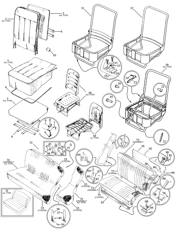 | # | PART # | DESCRIPTION | APPLICATION | Qty | BUY | SELL | | 1 | 37GR2504 | COVER-SEAT-FRONT | SPECIFY YEAR, BODY TYPE AND COLOR. | 2 | N/A | SELL | | 3 | ADA1510 | LINER-SQUAB BACK | | 2 | N/A | SELL | | 4 | 14G5618 | TUBE-TRIM FIXING-RUBBER | VARIOUS YEARS AND MODELS. | 1 | N/A | SELL | | 5 | 14A3804 | PAD-CUSHION | | 2 | N/A | SELL | | 6 | 47H9573 | STRAP-WEBBING | SOLD BY THE FOOT. | A/R | N/A | SELL | | 7 | 14A3839 | CLIP-STRAP TO FRAME | | 24 | N/A | SELL | | 8 | 14A3838 | PLATE-BACKING-STAPLE | | 24 | N/A | SELL | | 9 | 14A3837 | STAPLE-STRAP | | 24 | N/A | SELL | | 10 | ADA2643 | CLIP-TRIM FIXING | | A/R | N/A | SELL | | 11 | ADA4127 | FRAME-SEAT | 3RD TYPE-PASSENGERS SIDE. | 1 | N/A | SELL | | 12 | ADA4109 | FRAME-SEAT | 4TH TYPE-PASSENGERS SIDE. | 1 | N/A | SELL | | 13 | ADA2488 | CLAMP-SEAT LEG | | 4 | BUY | SELL | | 14 | ADA2489 | WASHER-PLATE | | 4 | BUY | SELL | | 15 | AJD6258Z | BOLT | | 4 | N/A | SELL | | | LWZ205 | SPRING WASHER, 5/16 | FOR AJD6258Z. | 4 | N/A | SELL | | 16 | PTZ803 | NUT | FOR ALIGNMENT. | 3 | N/A | SELL | | 18 | ADA652 | FRAME-SEAT | 1ST TYPE-DRIVERS SIDE. | 1 | N/A | SELL | | | ADA1791 | FRAME-SEAT | 2ND TYPE-DRIVERS SIDE. | 1 | N/A | SELL | | | ADA4518 | FRAME-SEAT-RECLINING | OPTIONAL EXTRA, R/H. | 1 | N/A | SELL | | | ADA4519 | FRAME-SEAT-RECLINING | OPTIONAL EXTRA, L/H. | 1 | N/A | SELL | | 19 | FRS416 | RIVET | | 1 | N/A | SELL | | 20 | RRS380 | RIVET | | 1 | N/A | SELL | | 21 | RRS514 | RIVET | | 2 | N/A | SELL | | | PWZ105 | FLAT WASHER, 5/16 ID | FOR RRS514. | 2 | N/A | SELL | | 22 | ADA2451 | SPRING | | 2 | N/A | SELL | | 23 | 24B4057 | HANDLE, SEAT FORWARD | | 2 | N/A | SELL | | 24 | 54K205 | SCREW | | 2 | N/A | SELL | | 31 | 135868 | SEAT ASSY.-REAR | 1ST TYPE, TO (C) 221841. | 1 | N/A | SELL | | | 182208 | SEAT ASSY.-REAR | 2ND TYPE, FROM (C) 221803. | 1 | N/A | SELL | | | ADA1517 | SEAT ASSY.-REAR | 3RD TYPE, FROM (C) 228510. | 1 | N/A | SELL | | 33 | 37GR2505 | COVER-SEAT-REAR | SPECIFY YEAR, BODY TYPE AND COLOR. | 1 | N/A | SELL | | 37 | ADA2694 | PLATE-PEG-R/H | | 1 | N/A | SELL | | 38 | ADA2695 | PLATE-PEG-L/H | | 1 | N/A | SELL | | 39 | ADA2691 | SLEEVE-RUBBER | | 2 | N/A | SELL | | 40 | AJD1245Z | SCREW | | 4 | N/A | SELL | | 41 | ADA2681 | TAG-SQUAB | | 1 | N/A | SELL | | 43 | AJD4246Z | SCREW | | 1 | N/A | SELL | | 44 | FWP610 | WASHER-CUP | | 1 | N/A | SELL | | 45 | AAA48 | STUB-SQUAB TAG | | 1 | N/A | SELL | | 47 | AJD7612 | WASHER-SPRING | | 1 | N/A | SELL | | 48 | AJD8012Z | NUT | | 1 | N/A | SELL | | 49 | LFS100 | WASHER | | 1 | N/A | SELL | | 50 | LFS107 | BODY SOCKET | | 1 | N/A | SELL | | 51 | ADA802 | BUFFER | | 3 | N/A | SELL | | 64 | ADA3959 | CASE-SPRING | TRAVELLER. | 1 | N/A | SELL | | 65 | AFA512 | RAIL-HINGE | TRAVELLER. | 1 | N/A | SELL | | 66 | ADA4029 | HINGE | TRAVELLER. | 2 | N/A | SELL | | 67 | AJD4344Z | SCREW | | 6 | N/A | SELL | | 68 | ADA6358 | NUT-WOOD FIXING | | 6 | N/A | SELL | | 69 | PTZ1004 | SCREW | | 4 | N/A | SELL | | | 271657 | BRACKET-CUSHION | TRAVELLER. | 2 | N/A | SELL | | 71 | AFA535 | PLATE-FINISHING | TRAVELLER. | 1 | N/A | SELL | | 72 | CTZ404 | SCREW | | 5 | N/A | SELL | | 73 | BDE1435 | CUSHION ASSEMBLY | TRAVELLER. | 1 | N/A | SELL | | 75 | 37GR2506 | COVER-SEAT-REAR-TRAV. | SPECIFY YEAR, BODY TYPE AND COLOR. | 1 | N/A | SELL | | 76 | ADA3969 | CASE-SPRING | TRAVELLER. | 1 | N/A | SELL | | 77 | ADA4029 | HINGE | TRAVELLER. | 2 | N/A | SELL | | 78 | AJD4248Z | SCREW | | 6 | N/A | SELL | | 79 | ADA6358 | NUT-WOOD FIXING | | 6 | N/A | SELL | | 80 | AAA4564 | BOLT-SQUAB SECURING | TRAVELLER. | 2 | N/A | SELL | | 81 | AJD4245Z | SCREW | | 8 | N/A | SELL | | 82 | ADA6358 | NUT-WOOD FIXING | | 8 | N/A | SELL | | 83 | AAA4565 | PEG-SQUAB LOCATING | TRAVELLER. | 2 | N/A | SELL | | 85 | AJD8012Z | NUT | | 2 | N/A | SELL | | 86 | AFF466 | PLATE-PEG-FINISHER | TRAVELLER. | 2 | N/A | SELL | | 87 | AFF465 | PLATE-PEG REINFORCING | TRAVELLER. | 2 | N/A | SELL | | 88 | ADA4012 | FINISHER-SQUAB-R/H | TRAVELLER. | 1 | N/A | SELL | | | ADA4013 | FINISHER-SQUAB-L/H | TRAVELLER. | 1 | N/A | SELL | | 89 | PWZ203 | WASHER | | 2 | N/A | SELL | | 90 | AFA660 | BRACKET-SQUAB-R/H | TRAVELLER. | 1 | N/A | SELL | | | AFA661 | BRACKET-SQUAB-L/H | TRAVELLER. | 1 | N/A | SELL | | 91 | ADA2689 | COVER-SQUAB BACK-DELUXE | TRAVELLER. | 1 | N/A | SELL | | 92 | ADA752 | STRIP-WEARING-CENTER | TRAVELLER, DELUXE. | 2 | N/A | SELL |