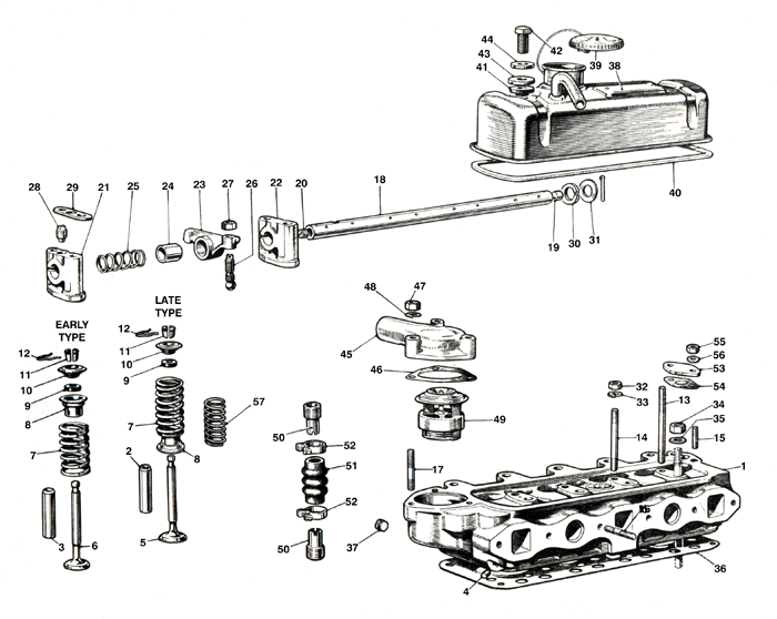 | # | PART # | DESCRIPTION | APPLICATION | Qty | BUY | SELL | | | 28G86 | CYLINDER HEAD WITH VALVE ASSEMBLY | SPRITE MKI | 1 | N/A | Sell | | | 28G132 | CYLINDER HEAD WITH VALVE ASSEMBLY | SPRITE MKII & MIDGET MKI | 1 | N/A | Sell | | 1 | 2A613 | CYLINDER HEAD WITH VALVE GUIDES | SPRITE MKI | 1 | N/A | Sell | | | 12A184 | CYLINDER HEAD WITH VALVE GUIDES | SPRITE MKII & MIDGET MKI | 1 | N/A | Sell | | | GEG102 | HEAD SET | | 1 | N/A | Sell | | 2 | 12A186 | VALVE GUIDE CI | | 4 | BUY | Sell | | | 12GR290 | VALVE GUIDE SIL/BRNZ | | 4 | N/A | Sell | | | 12GR290 | VALVE GUIDE SIL/BRNZ | | 4 | N/A | Sell | | 3 | 12A186 | VALVE GUIDE CI | | 4 | BUY | Sell | | 4 | 6K808 | PLUG-OIL HOLE | | 1 | N/A | Sell | | 5 | 2A6 | VALVE-INLET | SPRITE MKI TO (E)1396 | 4 | N/A | Sell | | | 2A877 | INT. VALVE | SPRITE MKI FROM (E)1397 | 4 | BUY | Sell | | | AEA574 | A/E VALVE | SPRITE MKII & MIDGET MKI | 4 | BUY | Sell | | 6 | AEA311 | VALVE SPRING, OUTER | SPRITE MKI TO (E)1396 | 4 | N/A | Sell | | | AEA358 | VALVE | SPRITE MKI FROM (E)1397 | 4 | N/A | Sell | | | AEA400 | VALVE-EXHAUST | SPRITE MKII & MIDGET MKI | 4 | N/A | Sell | | 7 | AEA311 | VALVE SPRING, OUTER | | 8 | N/A | Sell | | 57 | AEA401 | VALVE SPRING | SPRITE MKII & MIDGET MKI | 8 | N/A | Sell | | | VSP580P | VALVE SPRING SET | 8 EACH AEA311 & AEA401 | 1 | N/A | Sell | | 8 | 2A544 | SHROUD & OIL SEAL RETAINER - VALVE GUIDE | SPRITE MKI TO (E)1396 | 8 | N/A | Sell | | | 2A545 | COLLAR | SPRITE MKI FROM (E)1397 | 8 | N/A | Sell | | | AEA403 | COLLAR | SPRITE MKII & MIDGET MKI | 8 | N/A | Sell | | 9 | 2A9 | OIL SEAL FOR VALVES | SPRITE MKI TO (E)1396 | 8 | N/A | Sell | | | 2A879 | SEAL, VALVE STEM | SPRITE MKI & MKII FROM (E)1397 & MI | 8 | BUY | Sell | | 10 | 2A1015 | OIL THROWER | SPRITE MKI TO (E)1396 | 8 | BUY | Sell | | | 2A880 | CUP-VALVE SPRING-TOP | SPRITE MKI FROM (E)1397 | 8 | N/A | Sell | | | AEA402 | COLLAR-VALVE SPRING-TOP | SPRITE MKII & MIDGET MKI | 8 | N/A | Sell | | 11 | 2A11 | KEEPER | | 16 | BUY | Sell | | 12 | 2A12 | SPRING CLIP | | 8 | N/A | Sell | | 13 | 51K885 | STUD | | 2 | BUY | Sell | | 14 | 51K554 | STUD ROCKER PED SHT | SPRITE MKI | 2 | BUY | Sell | | | 51K1473 | STUD ROCKER PED SHT | SPRITE MKII & MIDGET MKI | 2 | BUY | Sell | | 15 | 53K402 | STUD HEATER TAP 1275 | | 2 | N/A | Sell | | 16 | 53K486 | STUD | INLET AND EXHAUST MANIFOLD (SHORT) | 2 | N/A | Sell | | | 53K487 | ENGINE STUD | INLET AND EXHAUST MANIFOLD (MEDIUM) | 2/6 | N/A | Sell | | | 53K488 | STUD | INLET AND EXHAUST MANIFOLD (LONG) | 2 | N/A | Sell | | 17 | 53K530 | ENGINE STUD | | 3 | N/A | Sell | | | 2A15 | SHAFT ASSEMBLY-VALVE ROCKER | | 1 | N/A | Sell | | | AEA90 | SHAFT ASSEMBLY-VALVE ROCKER | FROM (E)H12256 & L10996 | 1 | N/A | Sell | | 18 | 2A16 | SHAFT-VALVE ROCKER (PLUGGED) | | 1 | N/A | Sell | | 19 | 6K878 | PLUG-VALVE ROCKER SHAFT (PLAIN) | | 1 | N/A | Sell | | 20 | 2K4608 | PLUG | | 1 | N/A | Sell | | 21 | 2A22 | BRACKET-ROCKER SHAFT (TAPPED) | | 1 | N/A | Sell | | | 12A210 | BRACKET-ROCKER SHAFT (TAPPED) | FROM (E)H12256 & L10996 | 1 | N/A | Sell | | 22 | 2A23 | BRACKET-ROCKER SHAFT (PLAIN) | | 3 | N/A | Sell | | | 12A211 | BRACKET-ROCKER SHAFT (PLAIN) | FROM (E)H12256 & L10996 | 3 | N/A | Sell | | 23 | 2A533 | ROCKER-VALVE-BUSHED | | 8 | N/A | Sell | | | 2A964 | ROCKER-VALVE-BUSHED | ALTERNATIVE TO 2A533 - INTERCHANGAB | 8 | N/A | Sell | | 24 | 2A21 | BUSHING,ROCKER SHAFT | | 8 | BUY | Sell | | 25 | 6K556 | SPRING, ROCKER SPACING | | 3 | N/A | Sell | | 26 | 2A535 | SCREW, VALVE ADJUSTING | | 8 | N/A | Sell | | 27 | 6K654 | NUT, ADJUSTER LOCKING | | 8 | N/A | Sell | | 28 | 2A258 | LOCATING SCREW | | 1 | BUY | Sell | | 29 | 2A515 | PLATE LOCATING | | 4 | N/A | Sell | | 30 | 2A18 | WASHER DOUBLE COIL | | 2 | N/A | Sell | | 31 | 6K555 | WASHER, PLAIN | | 2 | N/A | Sell | | 32 | FNN105 | NUT | | 4 | N/A | Sell | | 33 | LWN205 | WASHER-SPRING-FOR STUD | | 4 | N/A | Sell | | 34 | 51K371 | NUT,CYLINDER HEAD | | 9 | BUY | Sell | | 35 | PWN106 | WASHER, FLAT | | 5 | N/A | Sell | | 36 | 2A689 | HEAD GASKET | SPRITE MKI TO (E)1168 | 1 | N/A | Sell | | | 2A935 | HEAD GASKET | SPRITE MKI FROM (E)1169 | 1 | N/A | Sell | | | 12A190 | HEAD GASKET | SPRITE MKII & MIDGET MKI | 1 | N/A | Sell | | 37 | AEC997 | PLUG-THERMAL INDICATOR BOSS (SCREWED) | | 1 | N/A | Sell | | 38 | AEA330 | COVER-VALVE ROCKER | SPRITE MKI | 1 | N/A | Sell | | | AEA601 | COVER-VALVE ROCKER | SPRITE MKII & MIDGET MKI | | N/A | Sell | | 39 | 8G612 | OIL CAP | | 1 | BUY | Sell | | | AEA607 | RESTRICTOR-COVER VENT ELBOW | | 1 | N/A | Sell | | 40 | GEG401 | VALVE COVER GASKET | | 1 | N/A | Sell | | 41 | 2K8568 | GROMMET, VALVE COVER | | 2 | N/A | Sell | | 42 | 2A150 | CAP NUT, VALVE COVER | | 2 | BUY | Sell | | 43 | 1B2925 | SPACER, VALVE COVER NUT | | 2 | N/A | Sell | | 44 | 2A2156 | CUP WASHER, V/C GROMMET | | 2 | N/A | Sell | | 45 | AEA306 | THERMOSTAT HOUSING | | 1 | BUY | Sell | | 46 | 12A29 | THERMOSTAT GASKET | | 1 | BUY | Sell | | 47 | FNZ105 | NUT - 5/16IN UNF | | 3 | N/A | Sell | | 48 | LVVZ205 | WASHER-SPRING-FOR STUD | | 3 | N/A | Sell | | 49 | 11K399 | THERMOSTAT (190 DEG) | TO (E)1073 | 1 | BUY | Sell | | | GTS102 | THERMOSTAT (165 DEG) | 165DEG | 1 | N/A | Sell | | | GTS104 | THERMOSTAT (180 DEG) | 180DEG | 1 | N/A | Sell | | | GTS106 | THERMOSTAT (190 DEG) | 195DEG | 1 | BUY | Sell | | 50 | 2A243 | CLAMP .59-.67' | | 1 | N/A | Sell | | 51 | 2A242 | HOSE, BY-PASS | | 1 | N/A | Sell | | 52 | 3H2963 | CLIP-BY-PASS CONNECTOR | | 2 | N/A | Sell | | 53 | 2A180 | BLANKING PLATE | | 1 | N/A | Sell | | 54 | 12A32 | GASKET,HEATER VALVE | | 1 | BUY | Sell | | 55 | FNN104 | NUT | | 2 | N/A | Sell | | 56 | LWN304 | WASHER-SPRING-FOR NUT | | 2 | N/A | Sell |